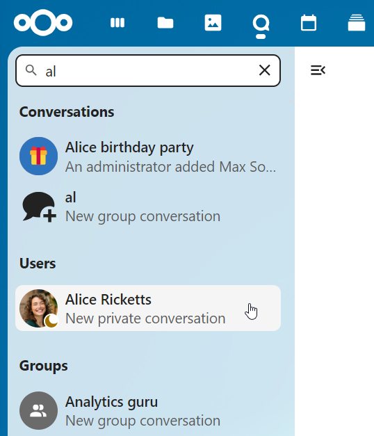 You can create a direct, one-on-one chat by searching for the name of a user, a group or a team and clicking it. For a single user, a conversation is immediately created and you can start your chat. For a group or circle you get to pick a name and settings before you create the conversation and add the participants.