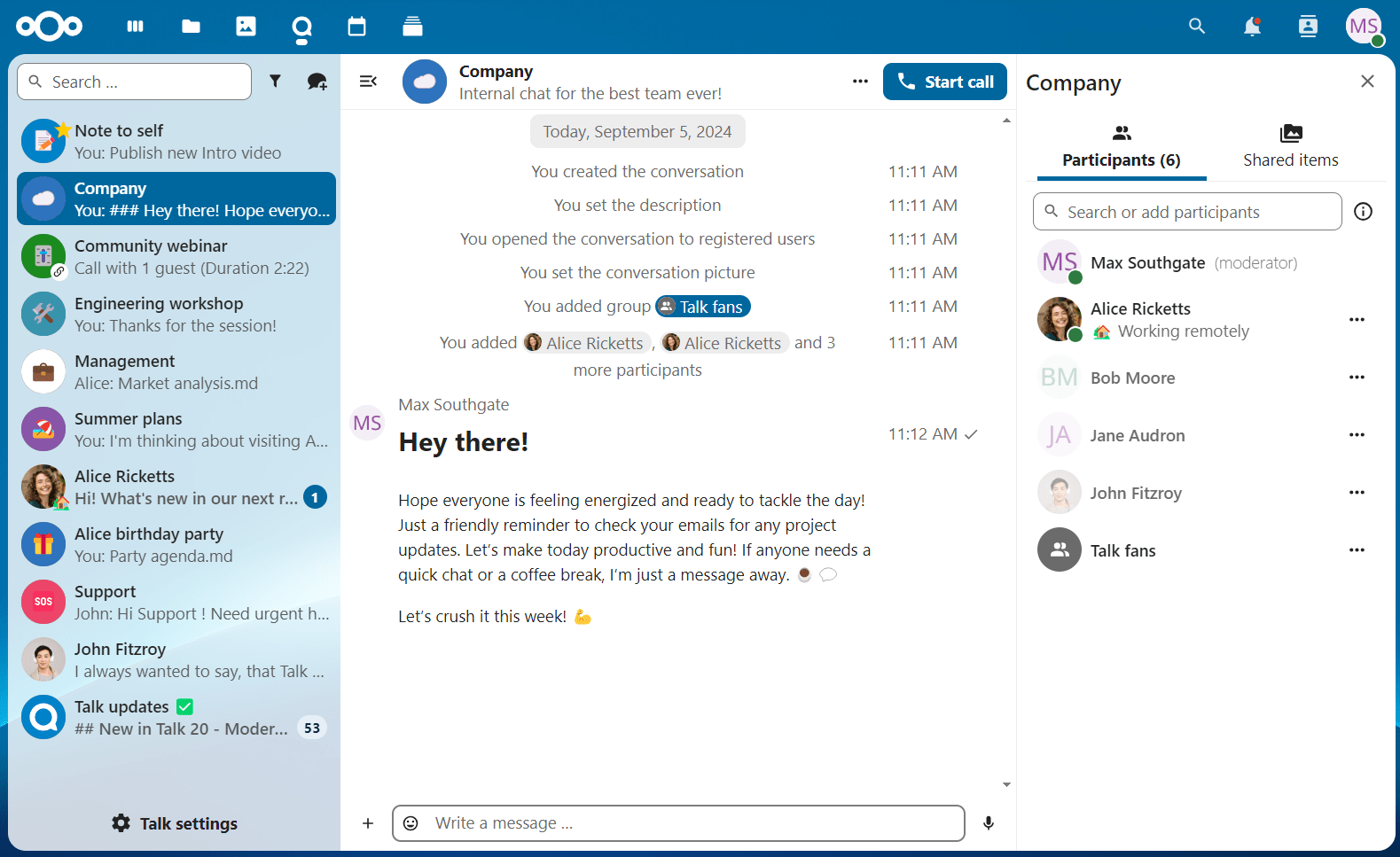 2. Group conversations. Besides the person who created the conversation, a group conversation can have any number of people in it. A group conversation can be shared publicly with a link, so external guest users can join a call. It can also be listed, so other people on your Nextcloud server can join the conversation.